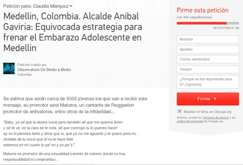 Para firmar, pidiéndole al alcalde de Medellín que detengan esta “equivocada estrategia para frenar el embarazo adolescente en Medellín”, puede ingresar a: http://www.change.org/es-LA/peticiones/medellin-colombia-alcalde-anibal-gaviria-equivocada-estrategia-para-frenar-el-embarazo-adolescente-en-medellin